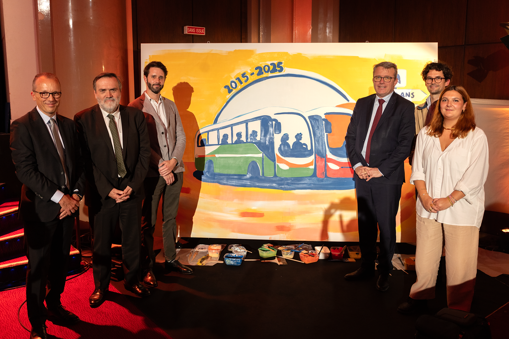 Et puisqu’un anniversaire appelle un symbole fort, la FNTV a choisi de marquer ces dix ans des cars Macron de manière originale et artistique. Une fresque a ainsi été réalisée en direct, inspirée par l’ensemble des échanges, des défis et des avancées partagés tout au long de cette journée. Cette œuvre incarne à la fois le chemin parcouru et l’énergie collective mobilisée pour construire l’avenir.